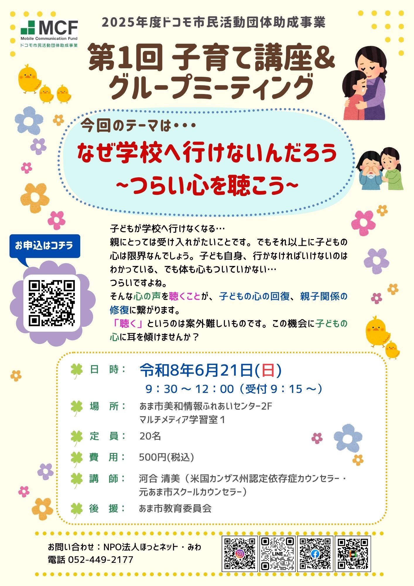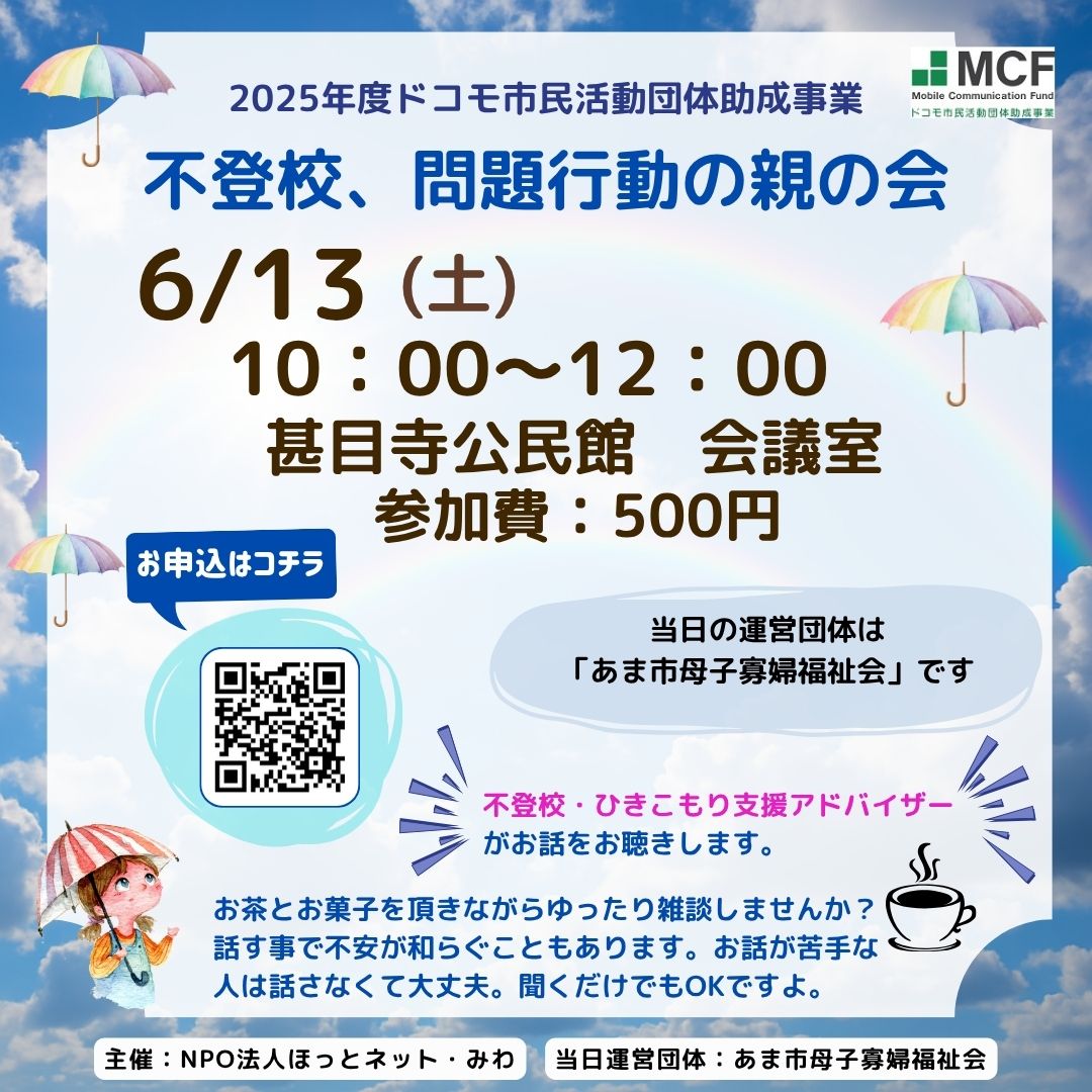 ★運営団体は、あま市母子寡婦福祉会です6/13(土) 10:00~12:00 お申し込みは→ここをクリック 「不登校や問題行動の親の会」・・・??ご安心くだ …