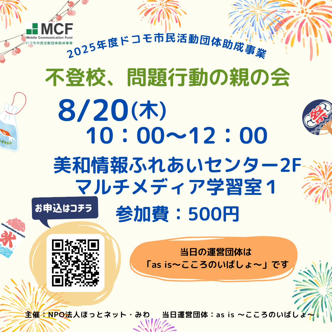 ★運営団体は、as is~心のいばしょ~です8/20(木) 10:00~12:00 お申し込みは→ここをクリック 「不登校や問題行動の親の会」・・・??ご安 …